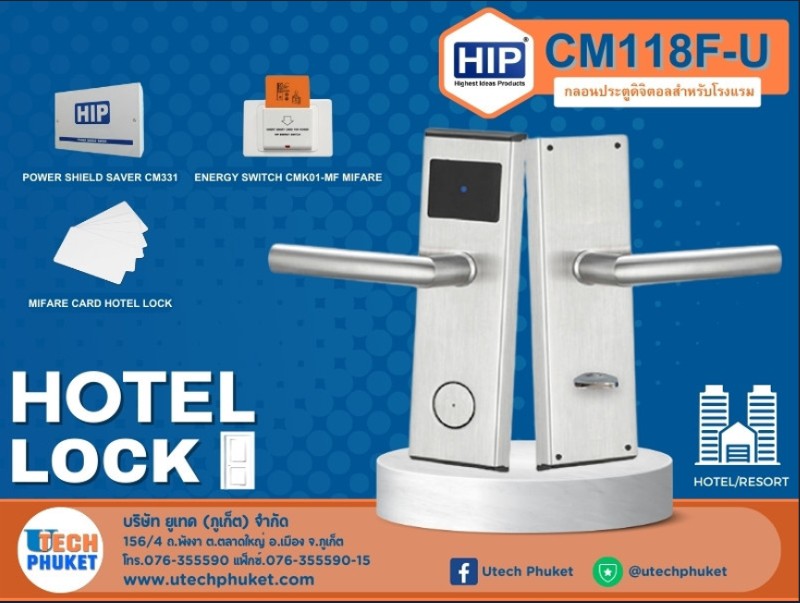 Hotel Lock ระบบล็อคประตูดิจิตอล HIP HOTEL LOCK CM118F-U HIP ได้ออกแบบ HOTEL LOCK เป็นแบบให้เหมาะสมกับการตกแต่งของทางโรงแรม ที่เต็มไปด้วยความหรูหราทันสมัย โค้งมลลดความแข็งกระด้างของตัวผลิตภัณฑ์แบบเดิม ๆ นำสมัย HOTEL LOCK HIP เพิ่มความคงทนด้วยวัสดุเทคโนโลยีที่ทันสมัย ใช้พลังงานไฟฟ้าต่ำ ช่วยประหยัดพลังงานและยืดอายุการใช้งานให้ยาวนานยิ่งขึ้น บริษัท ยูเทค ภูเก็ต จำกัด เราจำหน่าย และ ให้บริการ ติดตั้ง ระบบกล้องวงจรปิด CCTV , ตู้สาขาโทรศัพท์ PABX ระบบไวไฟอินเตอร์เน็ต , Hotel Lock , Door Lock ระบบตัดไฟในห้องพัก ECS BOX , ไฟฉุกเฉิน Emergency Light ระบบเปิด ปิด ประตูห้องพัก คอนโด อพาร์ทเม้น AccessControl ระบบไม้กระดก Carpark System โปรแกรมบริหารงานบุคคล เครื่องสแกนลายนิ้วมือ AccPayRoll เครื่องทำลายเอกสาร เครื่องนับธนบัตร เครื่องเคลือบบัตร อุปกรณ์ POS ลิ้นชัก ปริ้นเตอร์ เครื่องทำบาร์ โค้ด กระดาษแคชเชียร์ สติกเกอร์บาร์โค้ด หมึกพิมพ์ปริ้นเตอร์ หมึกเครื่องตอกบัตร หมึกอุปกรณ์สำนักงานทุกชนิด ที่ท่านหาซื้อที่ไหนไม่ได้อีกแล้ว เราพร้อมบริการในเขตภูเก็ต และพื้นที่จังหวัดใกล้เคียง รับปรึกษาพร้อมวางระบบ ให้คำแนะนำโดยไม่มีค่าใช้จ่าย ใดๆ ทั้งนี้เรายังรับวางระบบอุปกรณ์รักษาความปลอดภัย ให้แก่องค์กร บริษัท ห้างร้าน ด้วยผู้ชำนาญงานมีประสบการณ์มากกว่า 10 ปี Website : https://utechphuket.com/th Facebook : https://www.facebook.com/utechphuketall/ LINE : @utechphuket